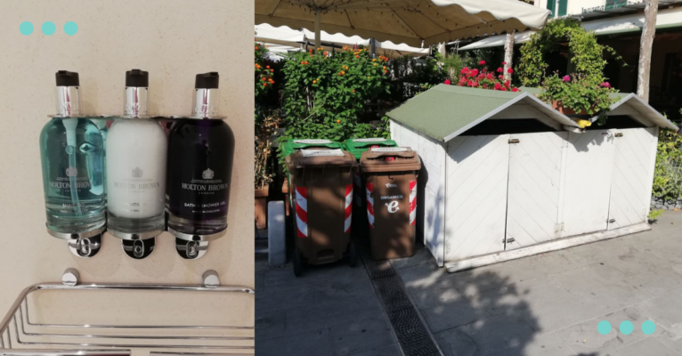 Деякі ресторани відправляють харчові відходи на компостування. Також італійські бізнеси дбають про скорочення споживання енергії, використовуючи енергоефективні технології та обладнання, збирають та відправляють вторсировину на переробку. Деякі з них також використовують екологічно чисті матеріали та методи виробництва. Ще одна цікава ініціатива — надання можливості купувати миючі засобі, гелі та інше у свою тару!