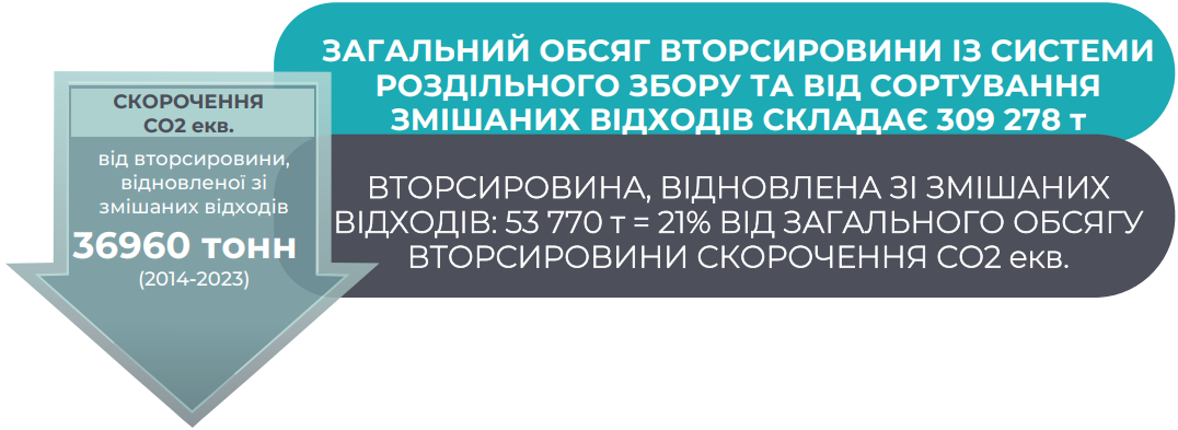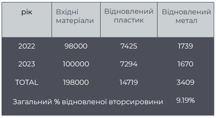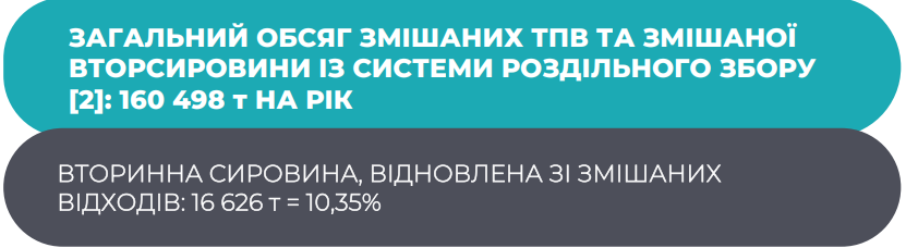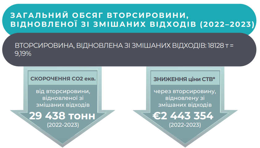 Загальний обсяг змішаних відходів, з яких здійснювалося відновлення вторинної сировини, склав 160 498 тонн на рік. Завдяки ефективному процесу сортування було вилучено 16 626 тонн вторинної сировини, що становить 10,35% від загального обсягу змішаних відходів.